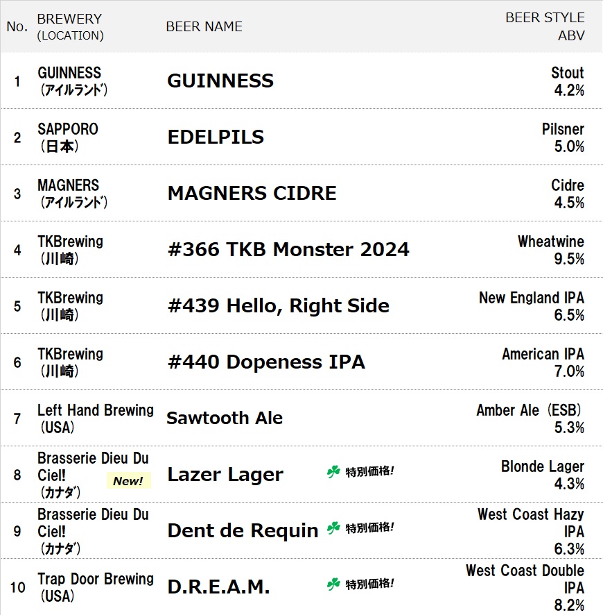 ※ ボトルビールの定番メニューは こちら をご覧ください。